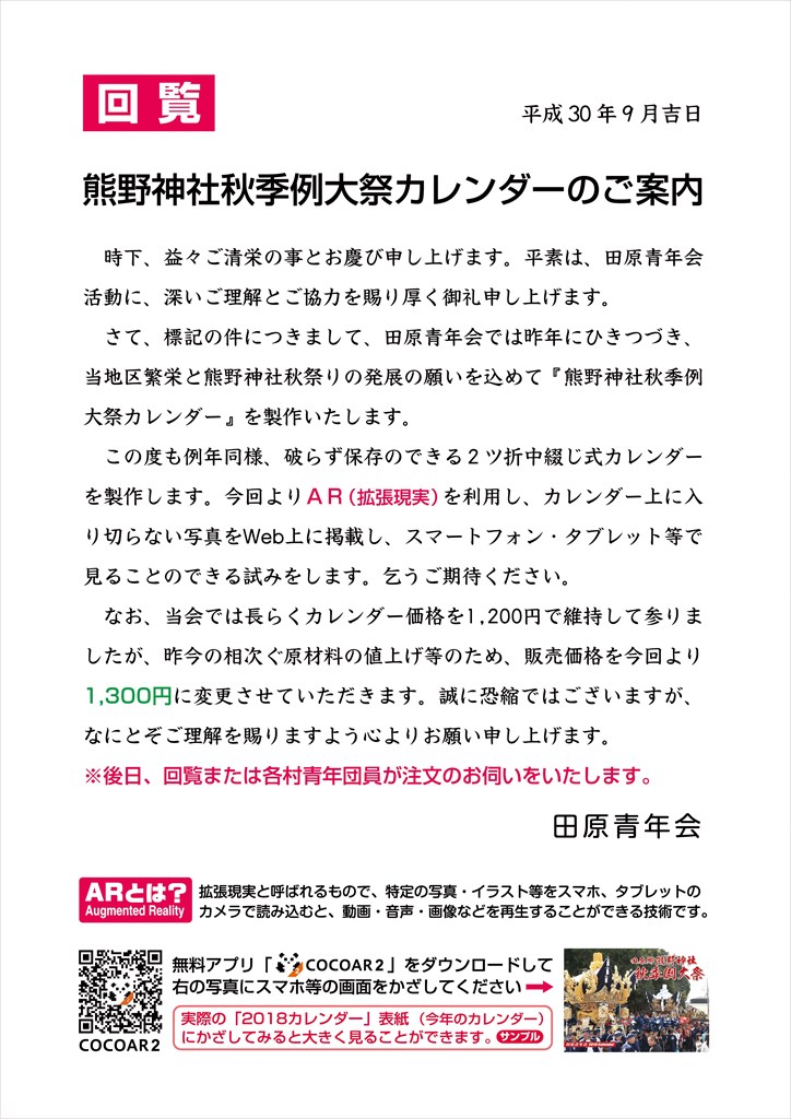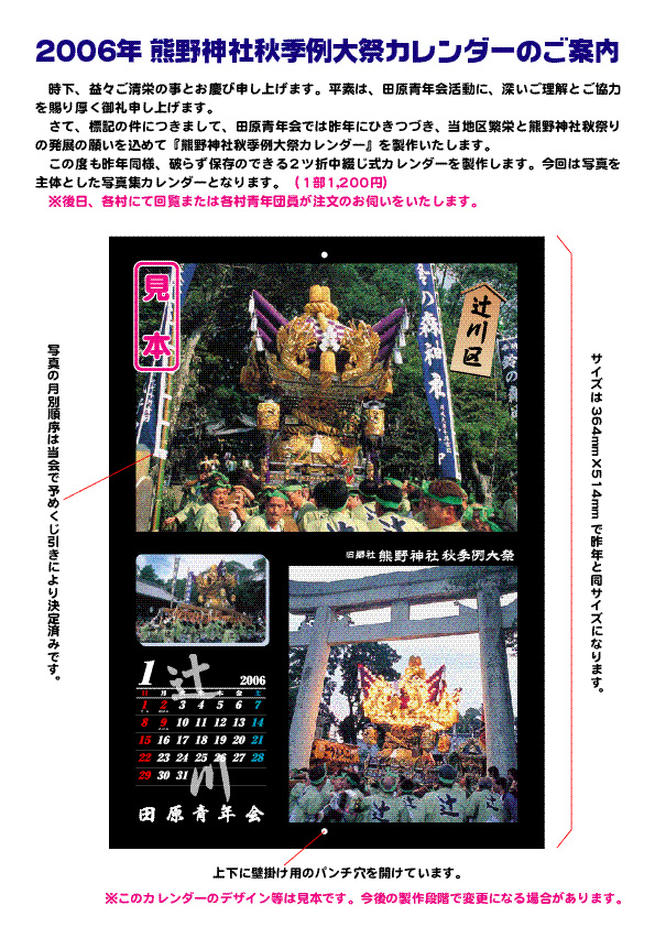今年も田原青年会が発行する「熊野神社秋季例大祭カレンダー」が完成いたしました。